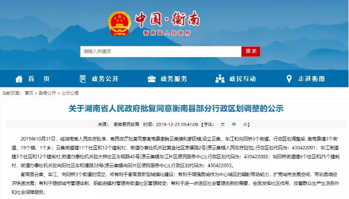 12月25日,衡南縣黨政門戶網(wǎng)發(fā)布《關(guān)于湖南省人民政府批復(fù)同意衡南縣部分行政區(qū)劃調(diào)整的公示》(以下簡(jiǎn)稱《公示》)?!豆尽分赋?,2019年10月31日,經(jīng)湖南省人民政府批準(zhǔn),省民政廳批復(fù)同意衡南縣撤銷云集鎮(zhèn)和廖田鎮(zhèn),設(shè)立云集、車江和向陽(yáng)橋3個(gè)街道。行政區(qū)劃調(diào)整后,衡南縣轄3個(gè)街道、19個(gè)鎮(zhèn)、1個(gè)鄉(xiāng);云集街道轄11個(gè)社區(qū)和12個(gè)建制村,街道辦事處機(jī)關(guān)駐黃金社區(qū)幸福路2號(hào)(原云集鎮(zhèn)人民政府駐地),行政區(qū)劃代碼為:430422001;車江街道轄3個(gè)社區(qū)和12個(gè)建制村,街道辦事處機(jī)關(guān)駐大橋社區(qū)車銅路45號(hào)(原云集鎮(zhèn)車江片區(qū)便民服務(wù)中心),行政區(qū)劃代碼為:430422002;向陽(yáng)橋街道轄6個(gè)社區(qū)和25個(gè)建制村,街道辦事處機(jī)關(guān)駐向陽(yáng)社區(qū)車和塘路28號(hào)(原云集鎮(zhèn)向陽(yáng)片區(qū)便民服務(wù)中心),行政區(qū)劃代碼為:430422003。