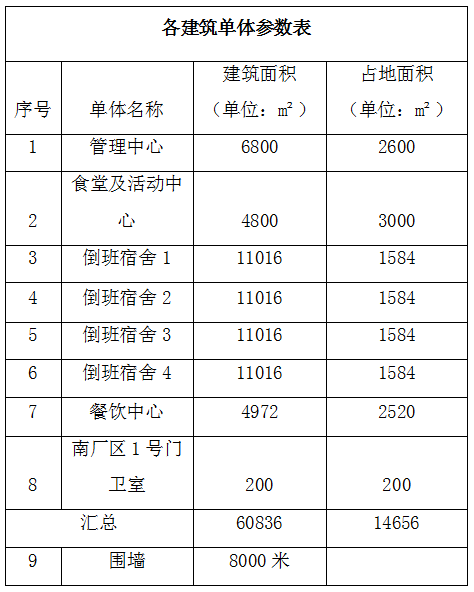 4、采購(gòu)項(xiàng)目?jī)?nèi)容包括:管理中心、食堂及活動(dòng)中心、倒班宿舍(暫定四棟)、餐飲中心、南廠區(qū)門衛(wèi)室、圍墻立面概念設(shè)計(jì),各單體參數(shù)如下表:
