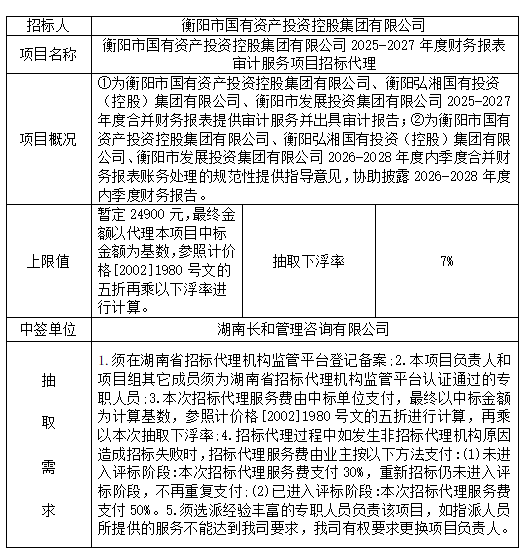 衡陽市國有資產(chǎn)投資控股集團有限公司2025-2027年度財務報表審計服務項目招標代理抽取結果公示