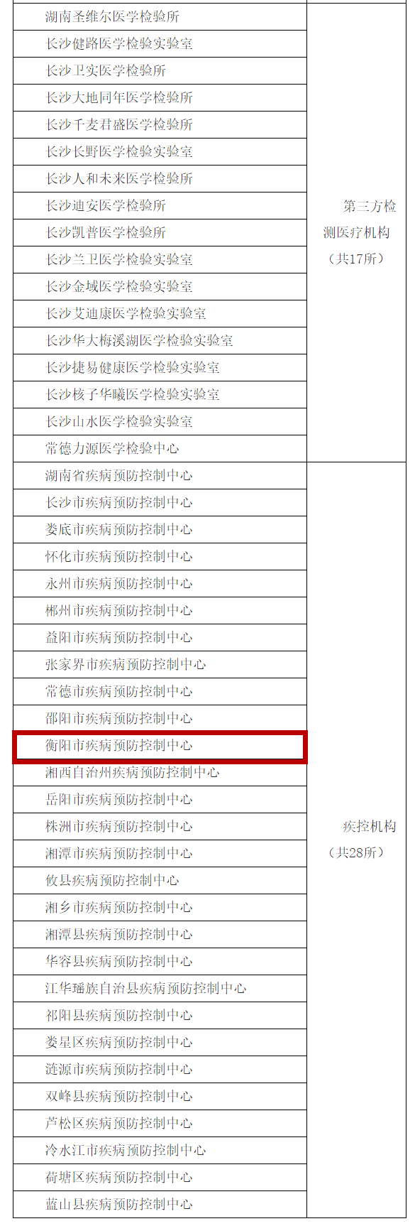經(jīng)國(guó)家衛(wèi)生健康委臨床檢驗(yàn)中心《新冠病毒核酸檢測(cè)信息平臺(tái)》查詢(xún),湖南開(kāi)展新冠病毒核酸檢測(cè)的醫(yī)療機(jī)構(gòu)名單5月19日下午公布。其中,衡陽(yáng)有9家醫(yī)療單位可開(kāi)展新冠病毒核酸檢測(cè),他們分別是南華大學(xué)附屬第一醫(yī)院、南華大學(xué)附屬第二醫(yī)院、南華大學(xué)附屬南華醫(yī)院、衡陽(yáng)市中心醫(yī)院、衡陽(yáng)市第一人民醫(yī)院、衡陽(yáng)市第三人民醫(yī)院、衡東縣人民醫(yī)院、常寧市人民醫(yī)院、衡陽(yáng)市疾病預(yù)防控制中心。具體名單如下: